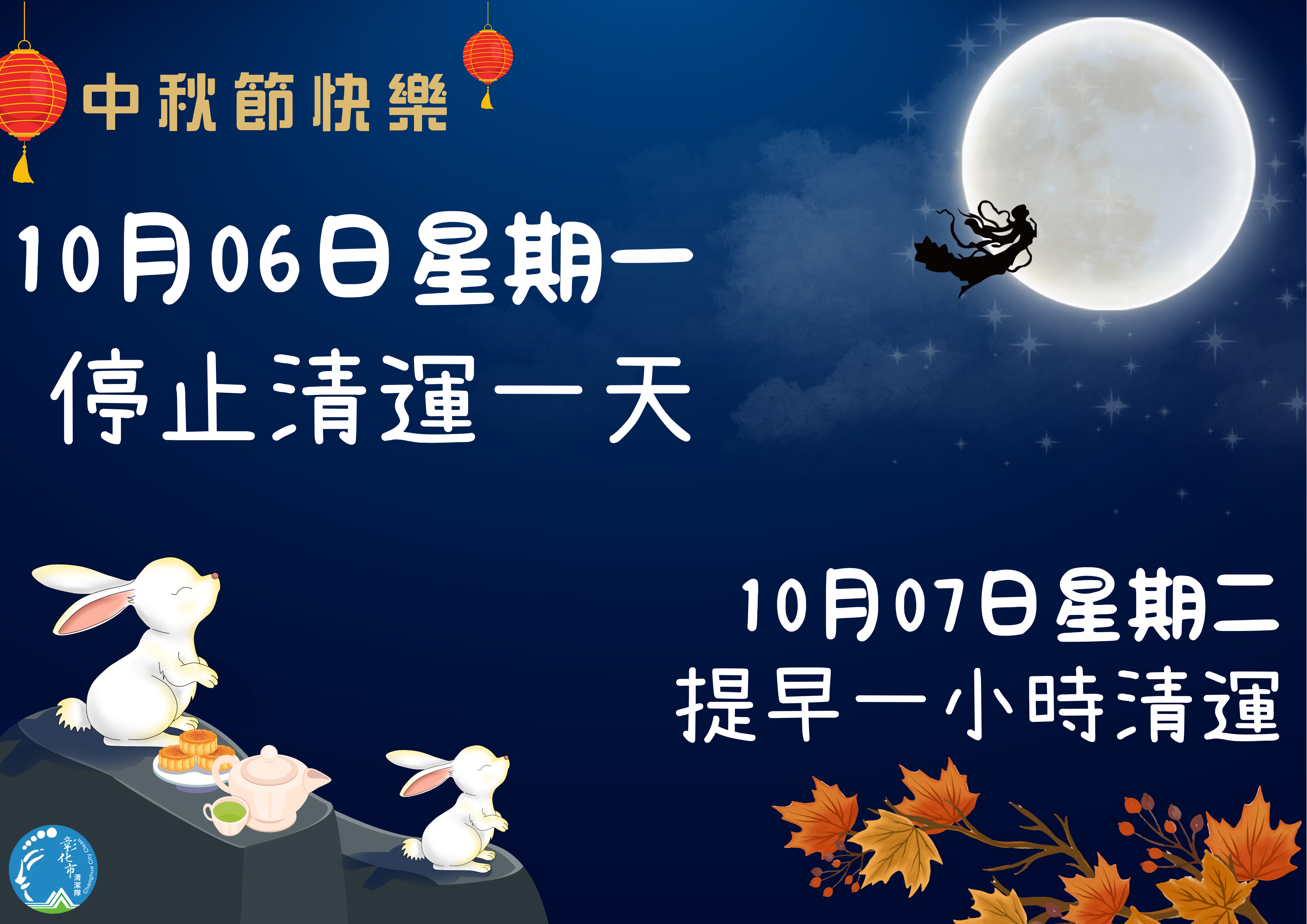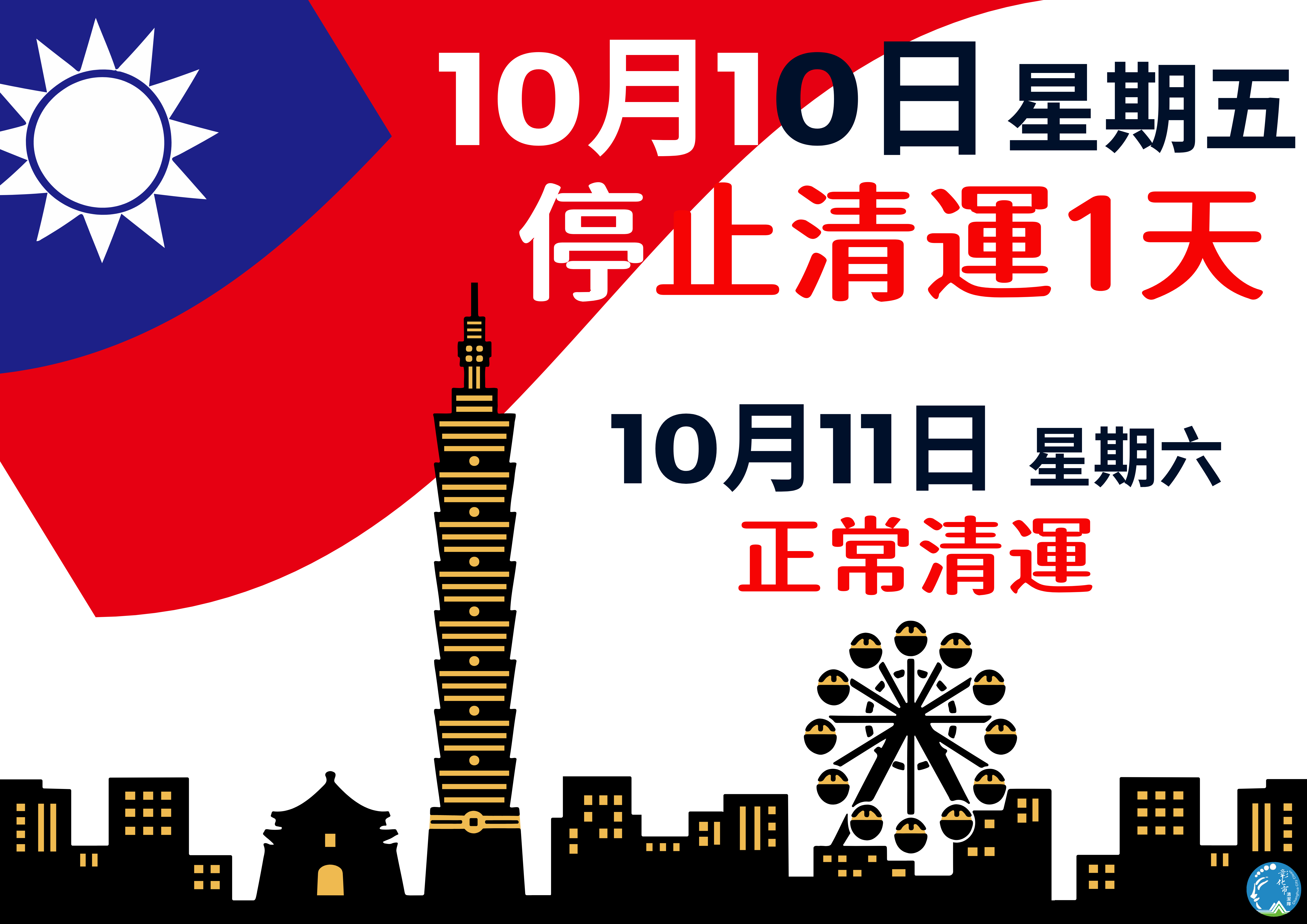 各位市民朋友們大家好! 小編我又又又來拉~ 沒錯~看到小編又來了代表連假又要到了, 繼教師節連假過後,接下來... 要換中秋節跟國慶日連假拉! 大家有想好要去哪玩了嗎? (怎麼感覺小編最近都在放假🤣🤣) 說到中秋節小編還是得嘮叨一下, 大家烤肉完記得,木炭要確實澆熄, 垃圾、生熟廚餘要記得分類, 比較長的竹籤記得對折再放入垃圾袋, 還有最重要的是垃圾不要亂丟, 讓我們一起維護市容環境, 這樣才是乖寶寶唷! 大家除了過中秋節之外, 也不要忘了還有我們最重要的國慶日唷! 在這邊小編預祝~ 「中華民國生日快樂」 「Taiwan生日快樂」 「Happy National Day」 那麼中秋節連假跟國慶日連假,垃圾該怎麼丟呢? 10月04日 (六),正 常 清 運。 10月05日 (日),休 息。 10月06日 (一),停 止 清 運。 10月07日 (二),正 常 清 運,提早一個小時清運。 10月08日 (三),休 息。 10月09日 (四),正 常 清 運。 10月10日 (五),停 止 清 運。 10月11日 (六),正 常 清 運。 10月12日 (日),休 息。 ※ 早上定點正常清運! #中秋節連假 #國慶日連假