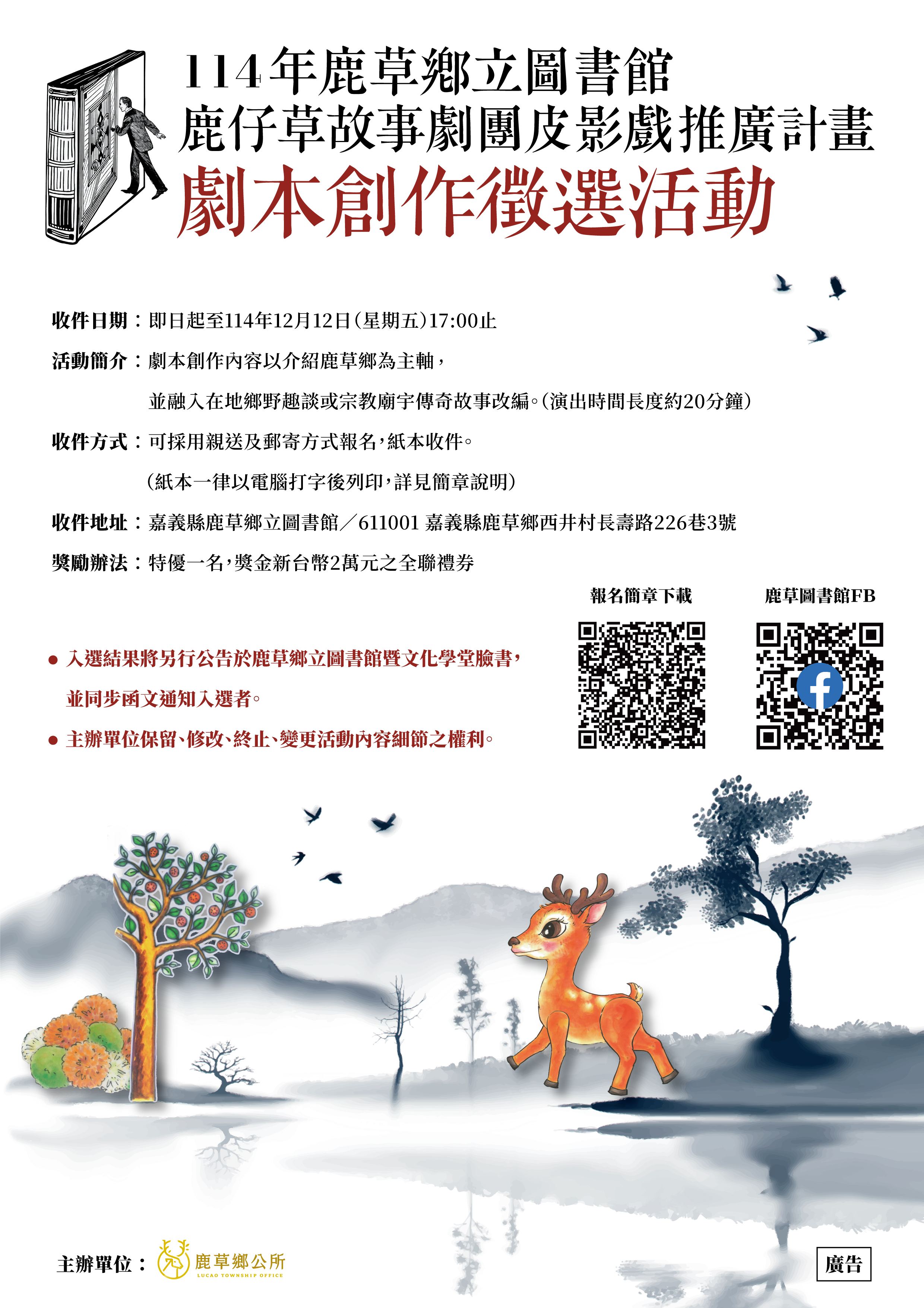 一、旨揭活動邀請國內優秀創作者投件,以鹿草鄉在地特色、 宗教傳說故事或鄉野趣聞等為創作題材,遴選切合主題且 劇情精彩的皮影戲優秀劇本,並交由本所文化志工之故事 劇團參與製作、排練等事宜,並於來年進行展演推廣