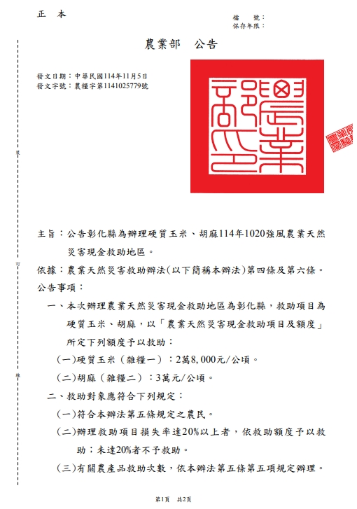 1. 依據農業部114年11月5日農糧字第1141025779號公告辦理。