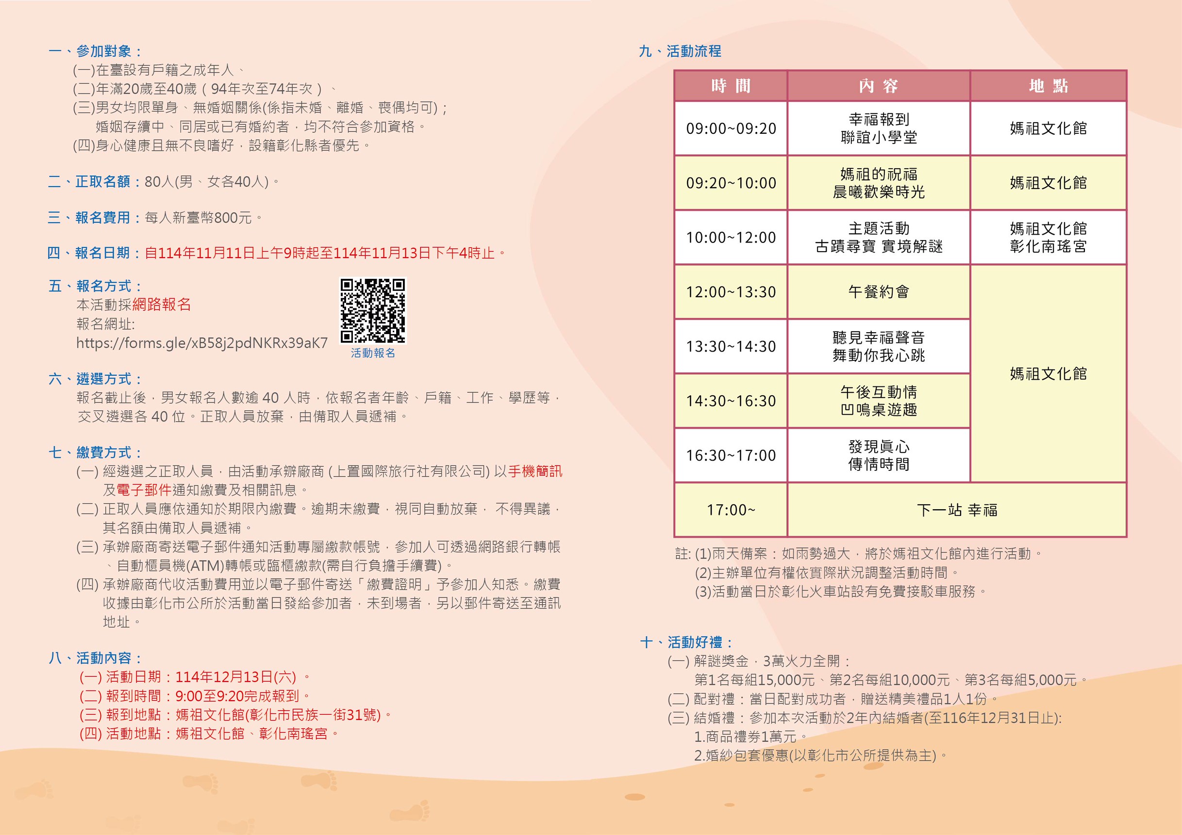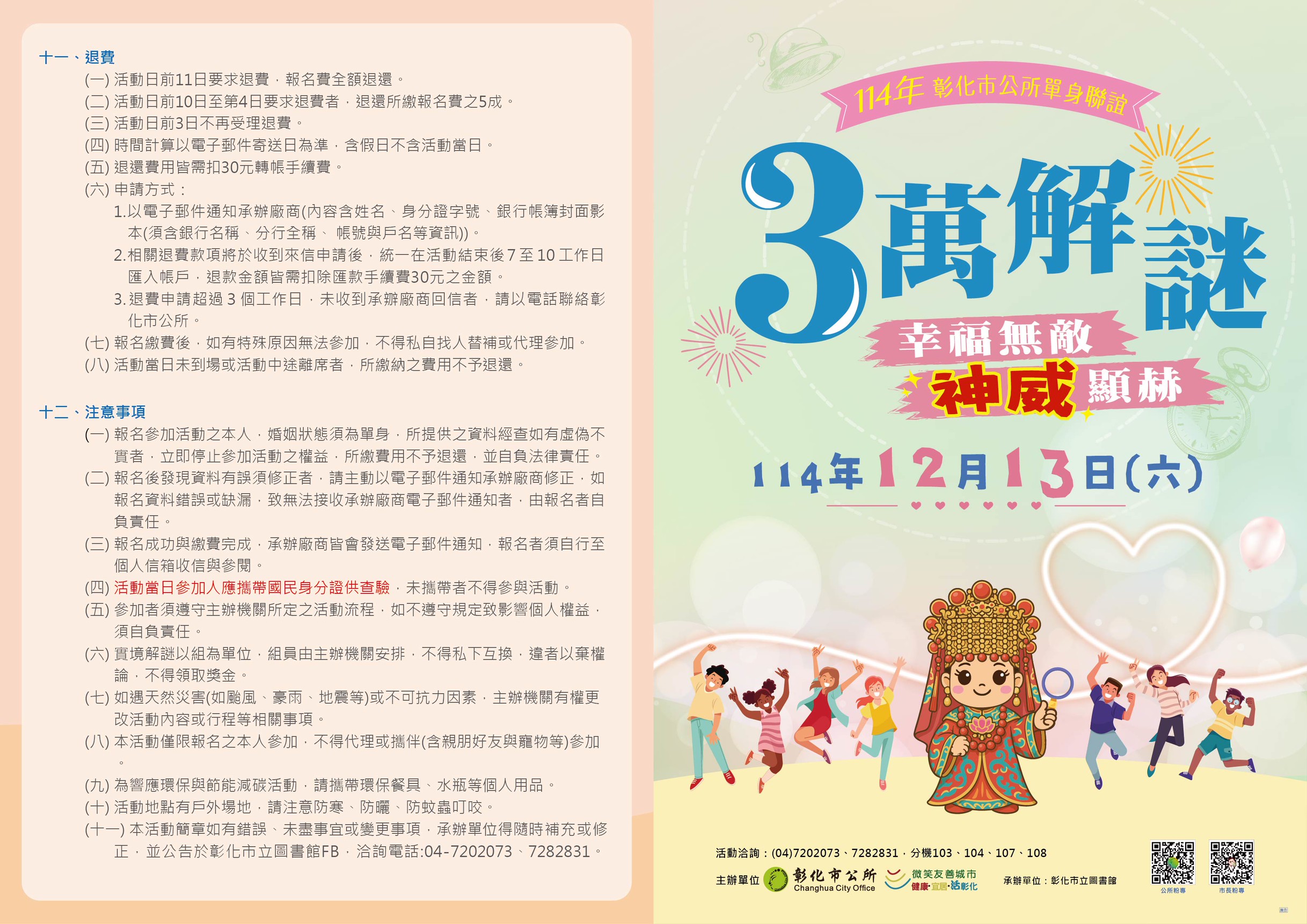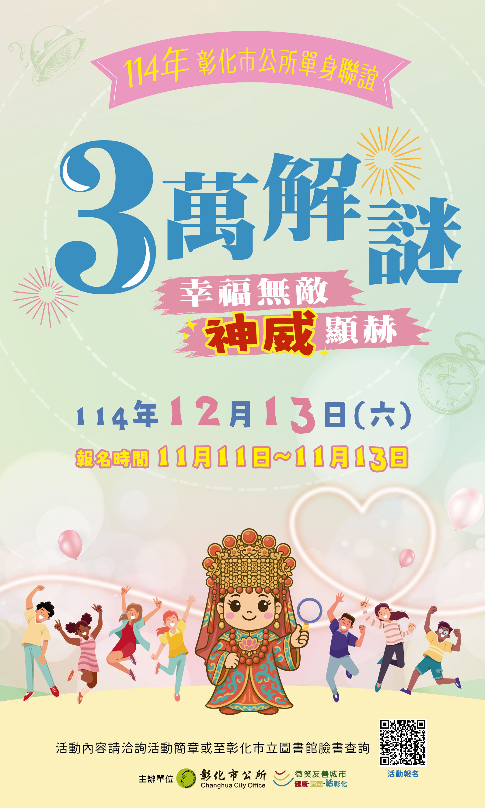 🔥「3萬解謎.幸福無敵~神威顯赫」🔥 由彰化市公所加碼推出、全台最夯的實境解謎聯誼再登場! 12月13日,我們要在最有庇佑力的【南瑤宮】展開一場浪漫又刺激的尋緣冒險~👣