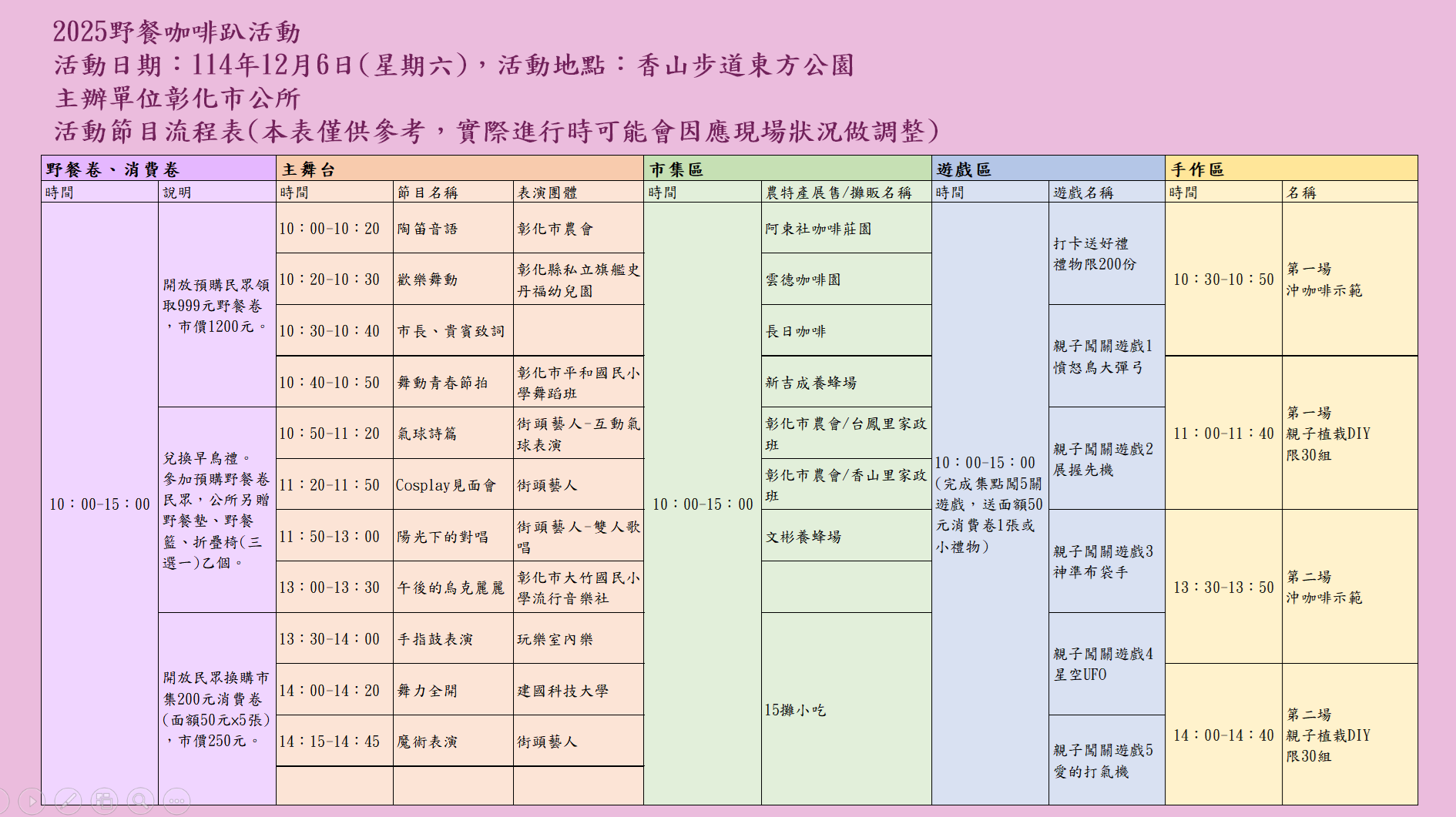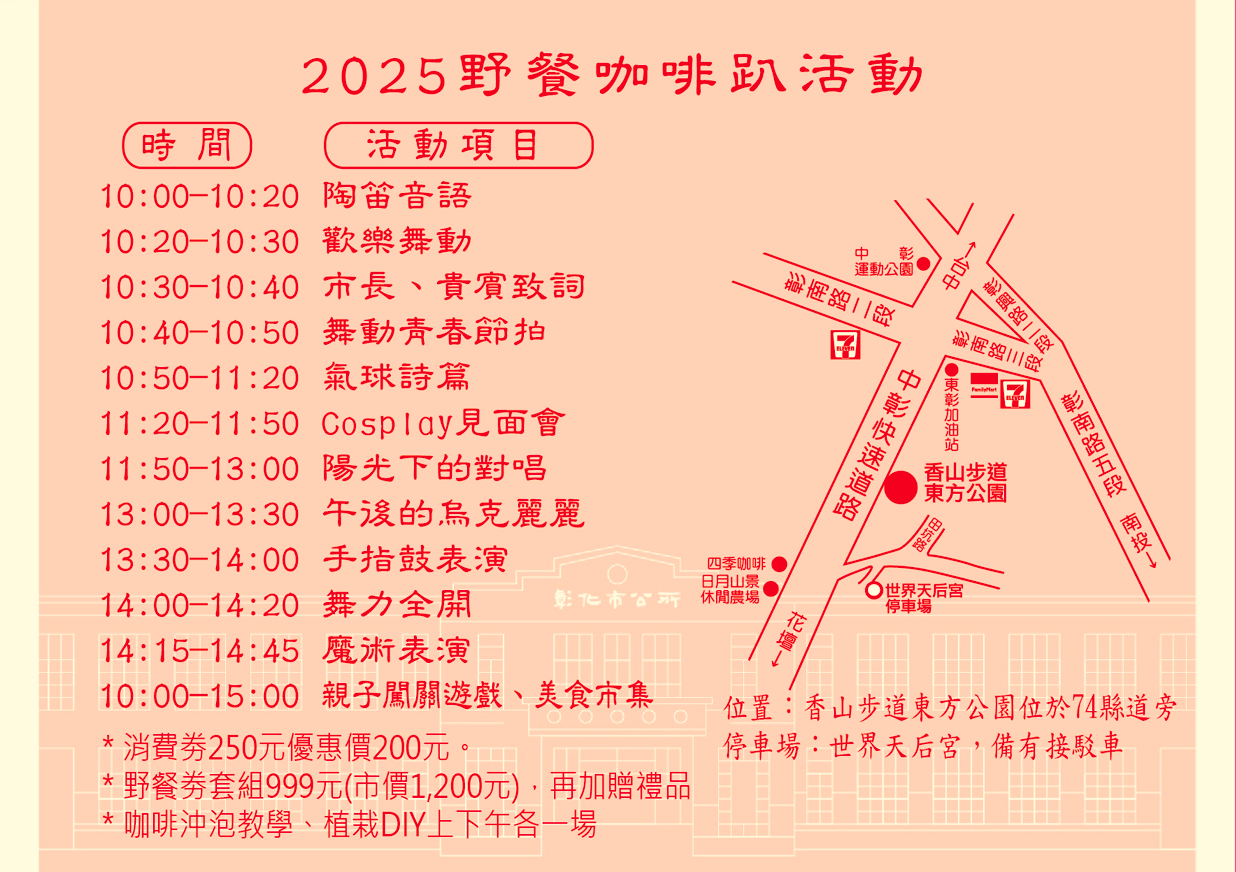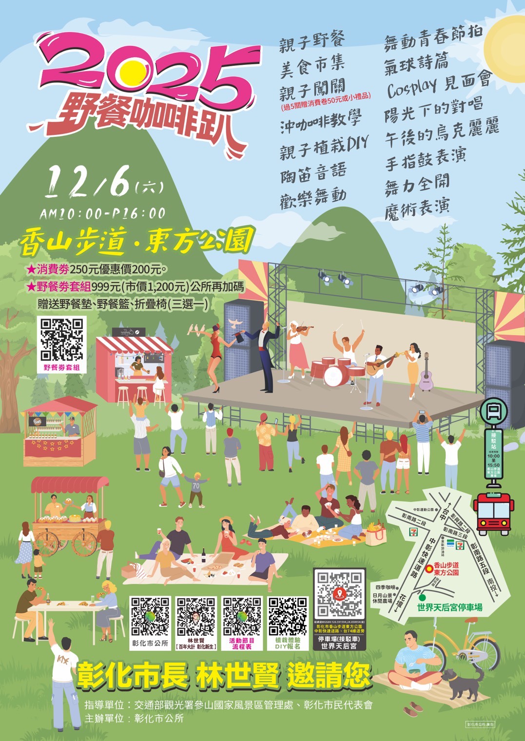 2025野餐咖啡趴活動 主辦單位:彰化市公所 活動日期:114年12月6日(星期六) 活動地點:香山步道東方公園 親子植栽DIY活動:114.11.17上午9點開放線上報名,網址:https://ppt.cc/fRoaGx ,彰化市公所為推廣城市綠美化運動,親子植栽DIY為免費活動,限定上午30組、下午30組 超值野餐券套組:線上預購區網址: https://ppt.cc/fLnwkx 野餐卷套組999元(市價1200元),預購繳費成功彰化市公所再加碼贈送野餐墊、野餐籃、折疊椅(三選一)限量100組,繳費日期:114.11.19(三)中午12點前(未繳費視同放棄),取餐時間:114.12.6(六)10:00-15:00香山步道東方公園散策服務台