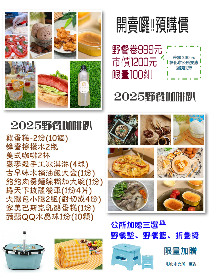 野餐卷999元,市價1200元(彰化市公所付200元回饋民眾),限量100組 現場.現領.現做--讓野餐變的更簡單 彰化市公所加碼送三選一,野餐墊/野餐籃/折疊椅 野餐劵美食有: 1.雞蛋糕-2份(10個) 2.蜂蜜檸檬水2瓶 3.美式咖啡2杯 4.嘉麥殺手工冰淇淋(4球) 5.古早味木桶油飯大盒(1份) 6.鈞鈞肉羹麵線糊加大碗(1份) 7.捲天下披薩餐車(1份4片) 8.大腸包小腸2組(對切成4份) 9.家美巴斯克乳酪蛋糕(1份) 10.蒟蒻QQ水晶球1份(10顆)