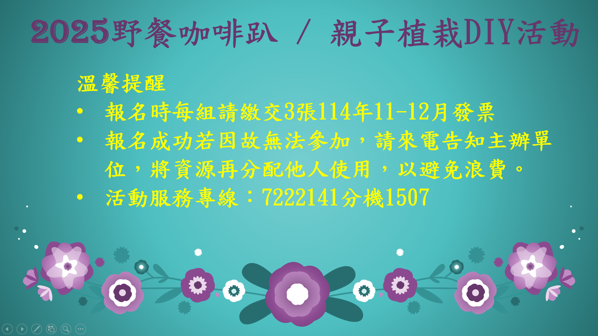 溫馨提醒 (1)報名成功若因故無法參加,請來電告知主辦單位,將資源再分配他人使用,以避免浪費。 (2)活動服務專線:7222141分機1507