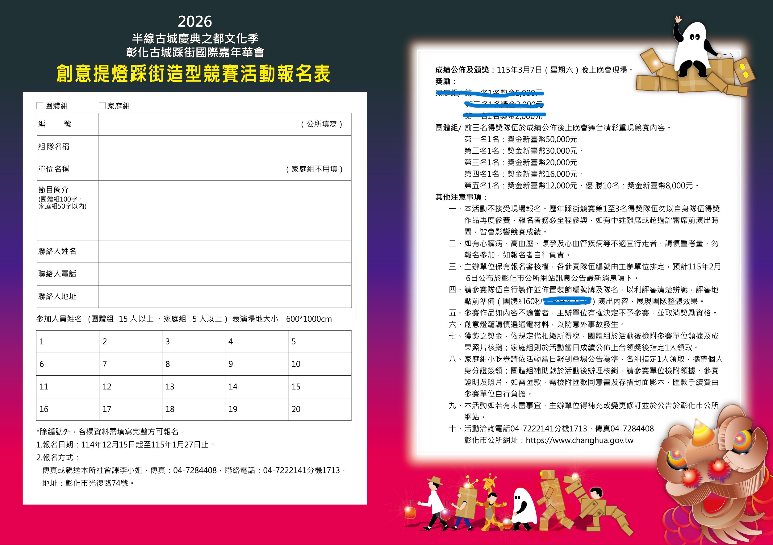十、活動洽詢電話04-7222141分機1713、傳真04-7284408、彰化市公所網址:https://www.changhua.gov.tw