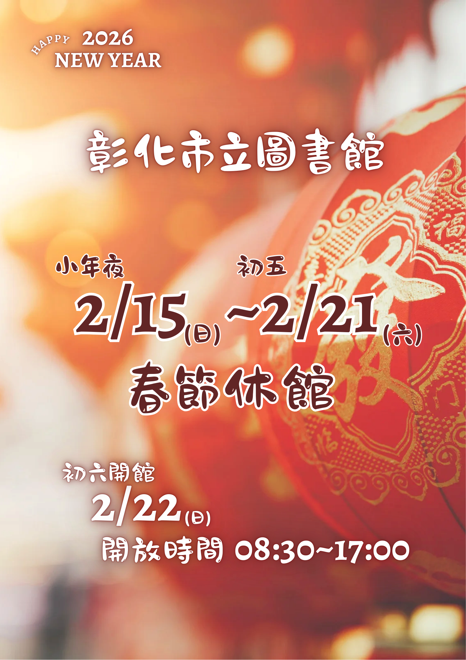 【休館公告】彰化市立圖書館自2月15日(日)至2月21日 (六)適逢春節期間休館,敬祝各位讀者新年快樂! 2/15(日)~2/21(六)春節休館 2/22(日)初六開館:08:30-17:00