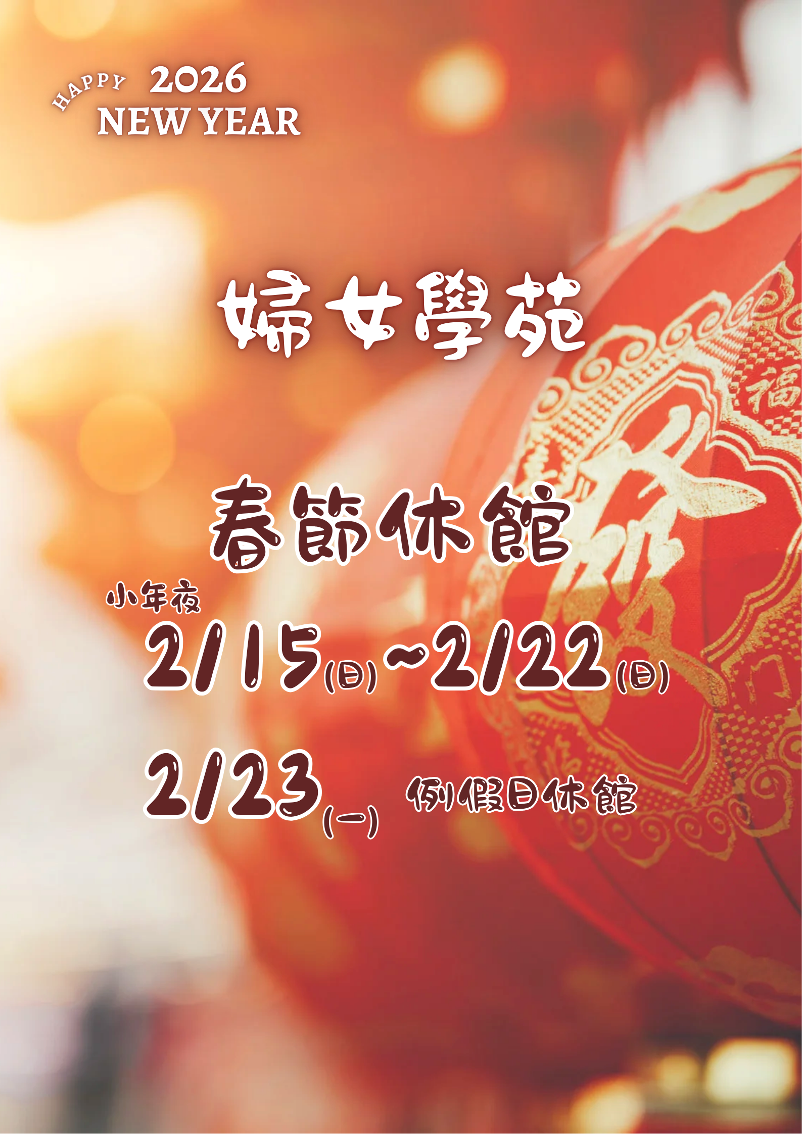 【休館公告】彰化市婦女學苑2月15日(日)至2月22日 (日)適逢春節期間休館,敬祝各位讀者新年快樂! 2/15~2/22春節休館 2/23 週一例假休館 2/24週二開放時間:08:30-20:30