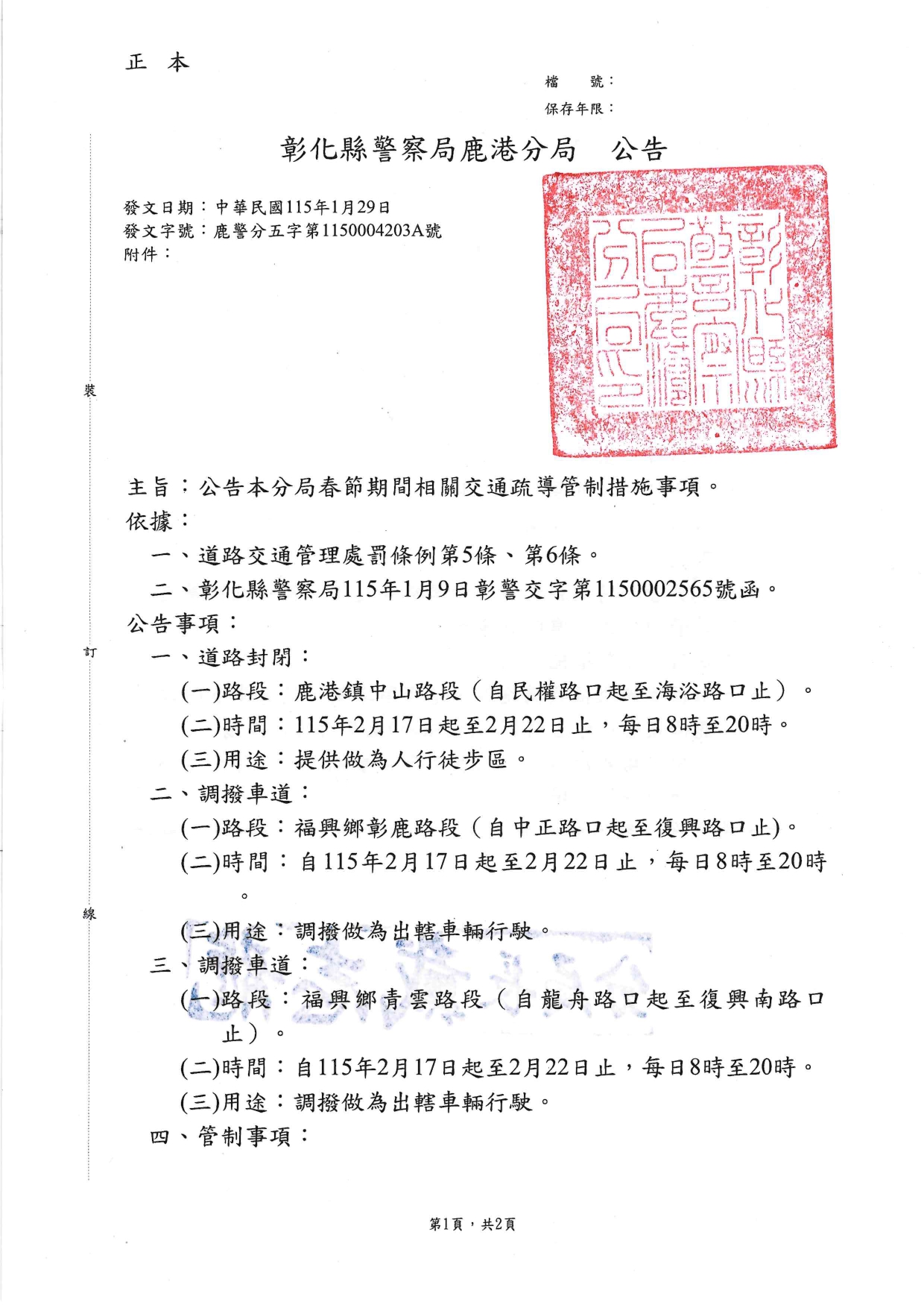 彰化縣警察局鹿港分局春節期間相關交通疏導管制措施事項公告函.pdf