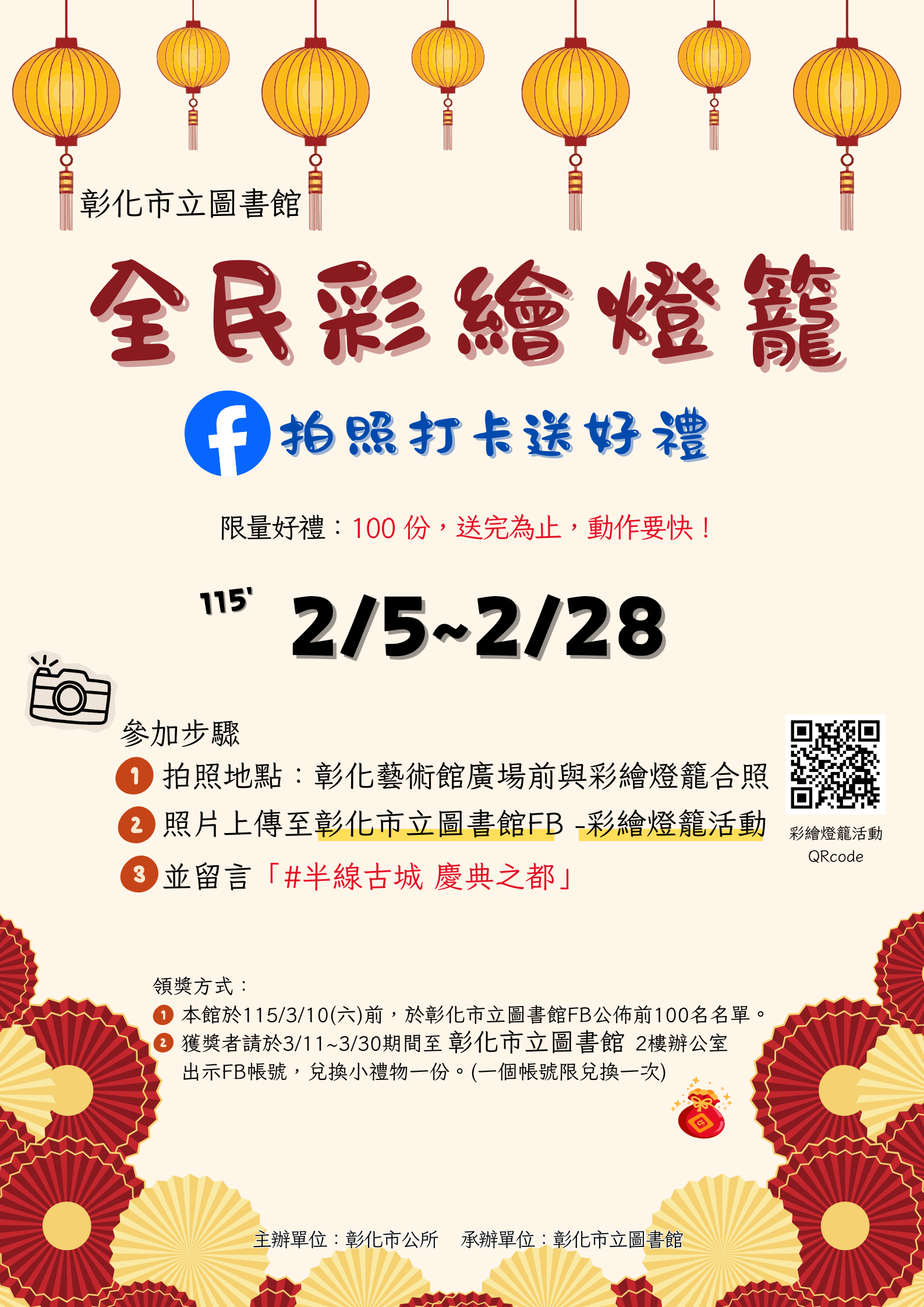 🎁 限量好禮 100 份,送完為止,手刀要快! 📅 活動期間:2/5~2/28止 📸領獎方式: 本館於115/3/10(六)前,於彰化市立圖書館FB公佈前100名名單。 獲獎者請於3/11~3/30期間至 #彰化市立圖書館2樓辦公室 出示FB帳號,兌換小禮物一份。(一個帳號限兌換一次)