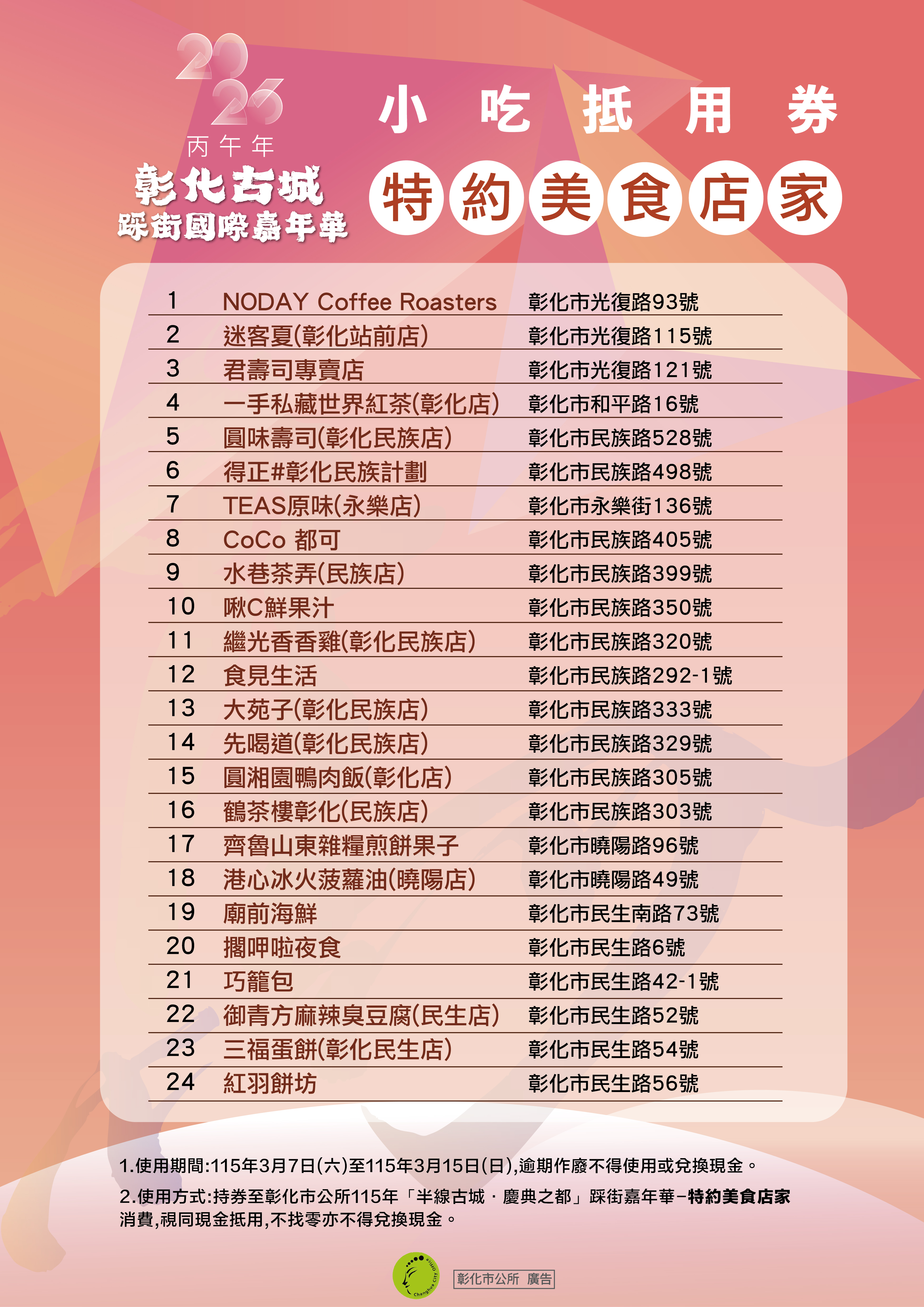 公告115年「半線古城・慶典之都」踩街嘉年華-小吃抵用券特約美食店家