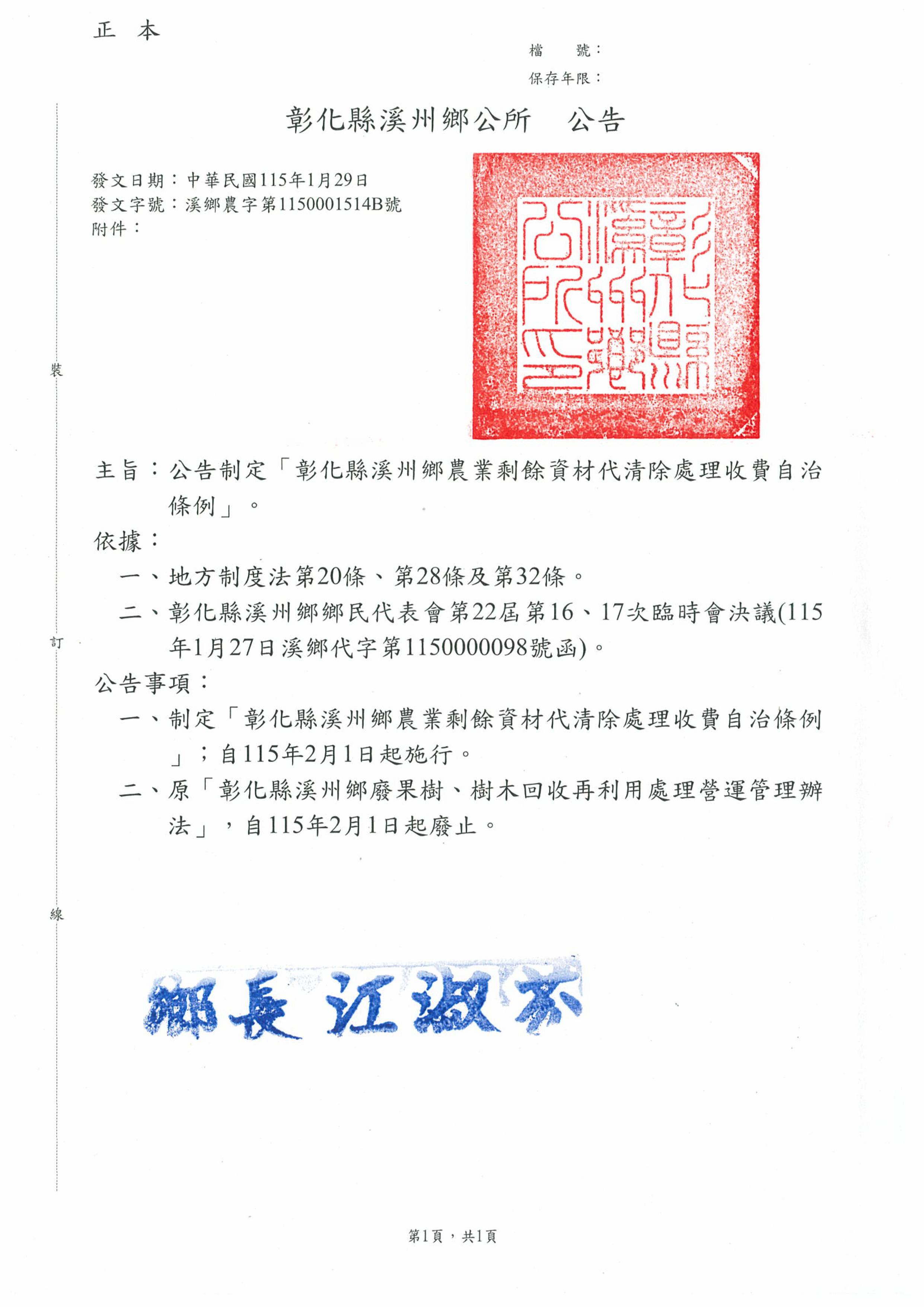 • 制定彰化縣溪州鄉農業剩餘資材代清除處理收費自治條例(公告)