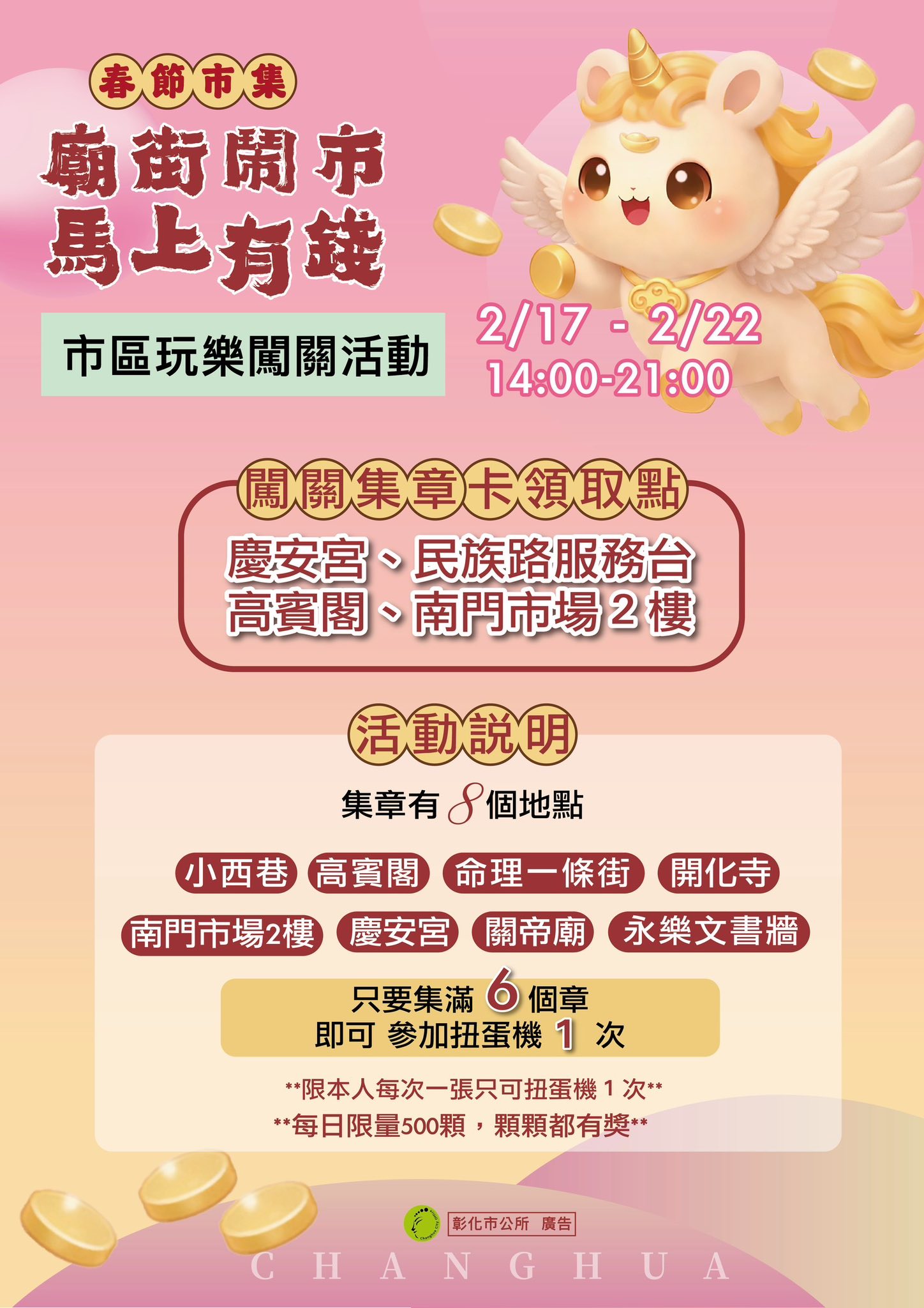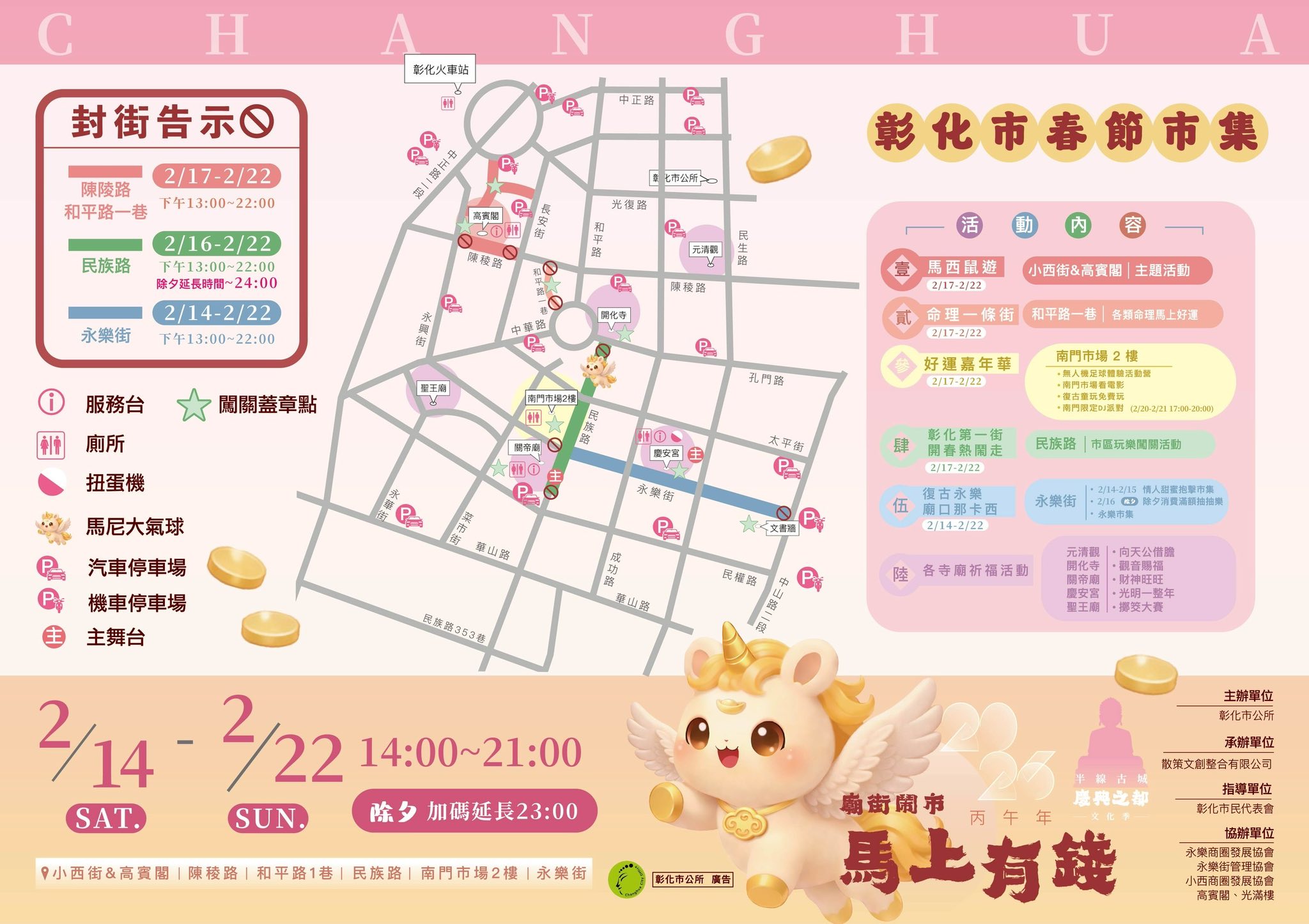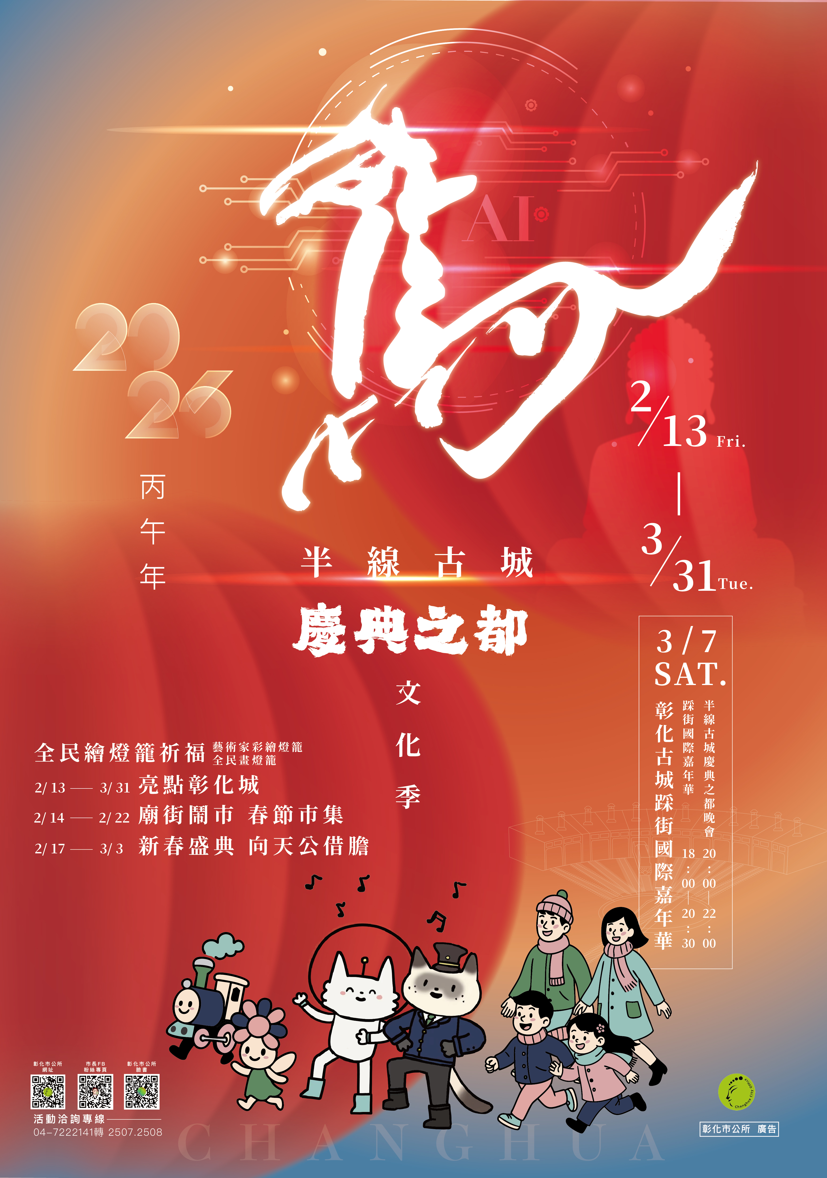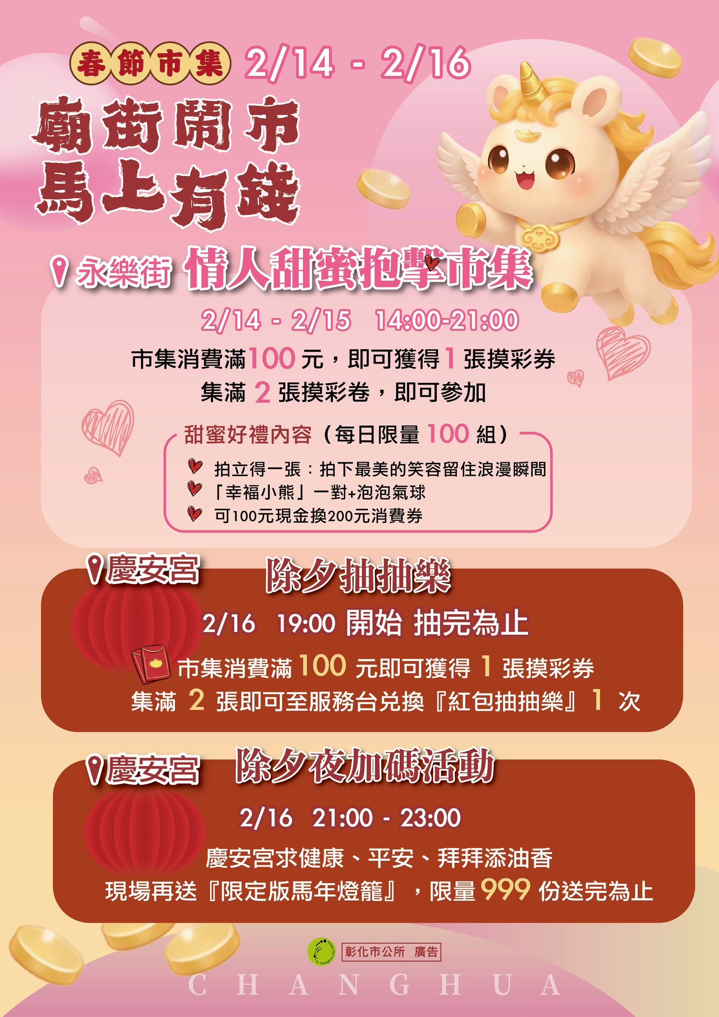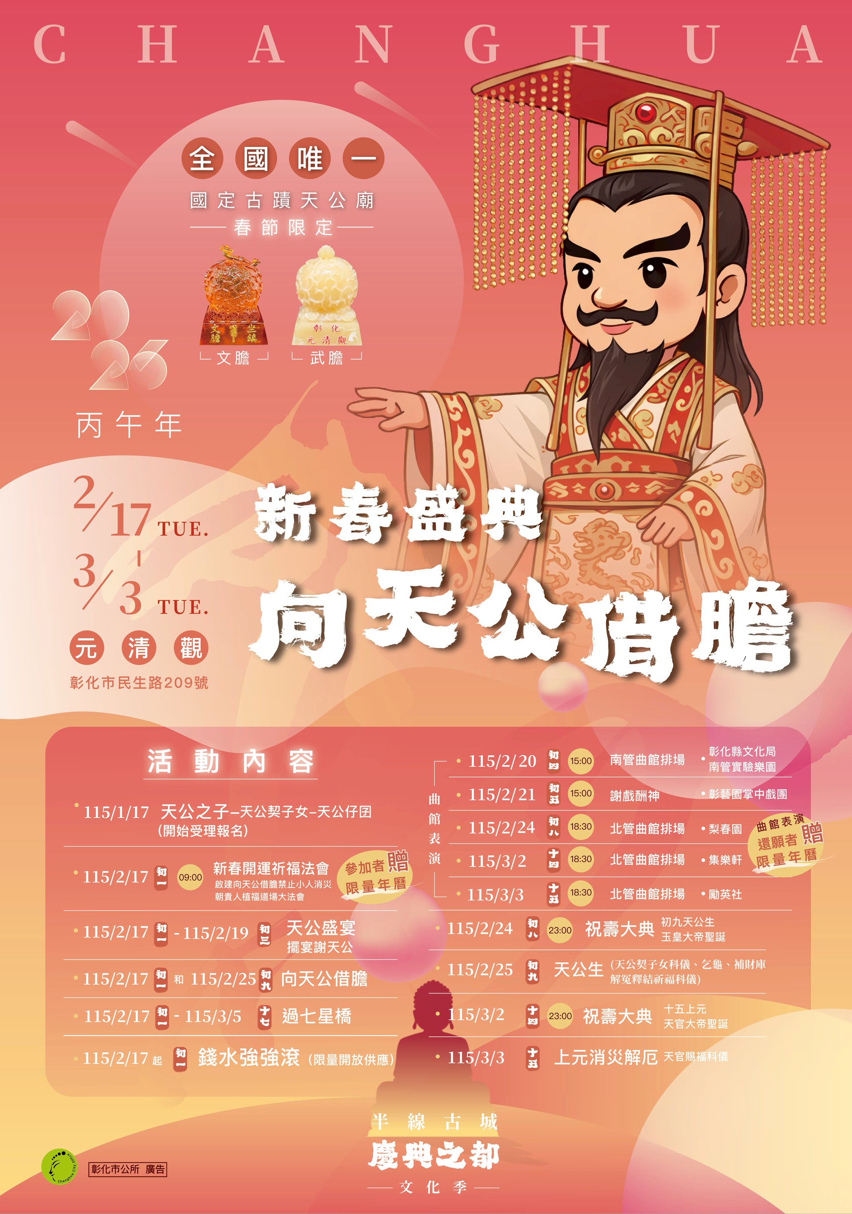 林世賢市長指出,彰化古城有文化,所以有靈魂,也因有文化,城市充滿了溫度!為了發揚古城的靈魂、保持古城的溫度,從115年2月13日亮點彰化城開跑,緊接著2月14日廟街鬧市馬上有錢春節市集(2月14日至2月22日)、南瑤宮除夕路跑迎頭香、大年初一四城門小旅行、新春盛典-向天公借膽系列活動(初一至十五)熱鬧登場,還有3月7日彰化古城踩街國際嘉年華,精彩活動一波波展開。