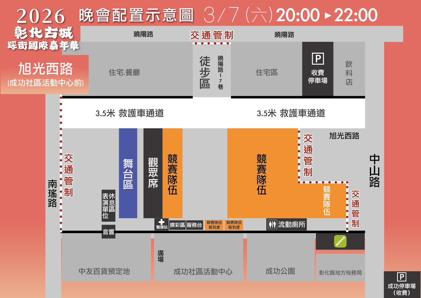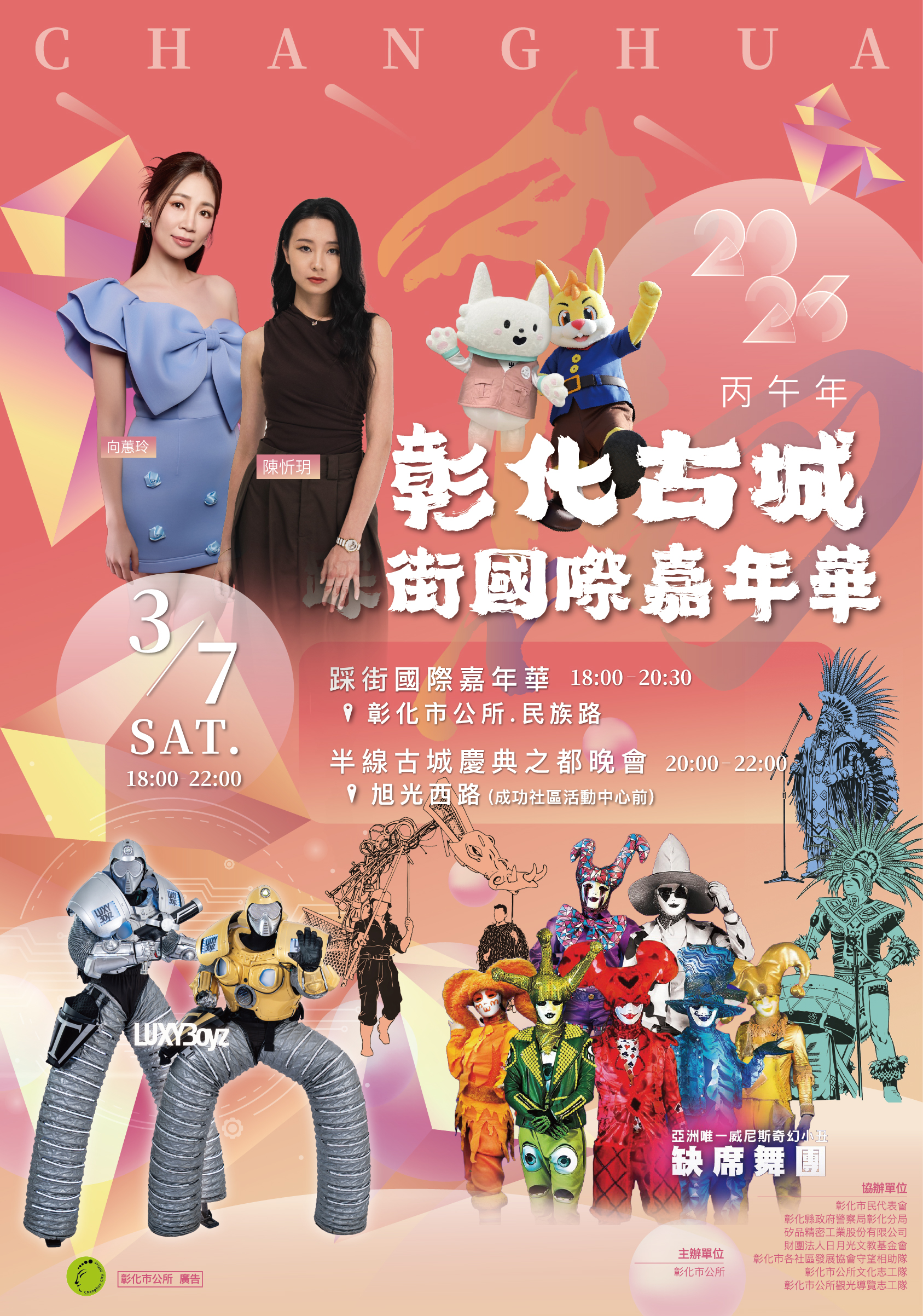 市公所表示,3月7日踩街活動自晚上6點開始,分兩條路線進行,一條為競賽隊伍路線、一條為表演隊伍路線,其中表演隊伍路線以彰化市公所為起點,繞行光復路-和平路-三角公園-民族路-曉陽路-旭光西路。這次表演隊伍融合異國與在地表演元素,邀請曼加非洲戰鼓團、安地斯樂團、菎萊布達亞旺、鳳天神鼓、新新向榮舞團、斯莉甘蒂舞團、布托格德魯克舞蹈團、彰化縣新移民協會以及鹿頂舞蹈團、身聲跨劇場、麗寶樂園、缺席舞團、舞媂創意舞蹈團、直排輪、獨輪車與在地學校管樂等表演,演出精彩可期,歡迎民眾一齊來參與。