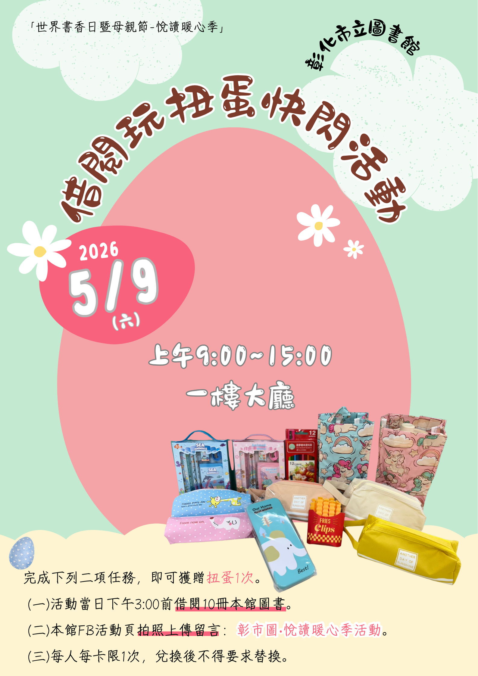 📚💐【扭蛋快閃活動】💐📚 為迎接「世界書香日暨母親節」,彰化市立圖書館準備了超有趣的驚喜活動等你來參加!✨ 🎉 只要完成任務,就能免費扭蛋一次! 有機會把可愛又實用的小禮物帶回家🎁 📅 活動時間|2026/5/9(六) ⏰ 上午9:00-下午15:00 📍 活動地點|圖書館一樓大廳 📝 參加方式很簡單: ✔ 當天下午3:00前借閱「10本館藏圖書」 ✔ 在本館FB活動頁拍照上傳留言:「彰市圖・悅讀暖心季活動」 🎁 完成以上兩項任務,即可獲得扭蛋1次! 📌 小提醒: ▪ 每人每卡限1次 ▪ 兌換後恕不更換 帶著媽媽、家人或朋友一起來圖書館走走📖